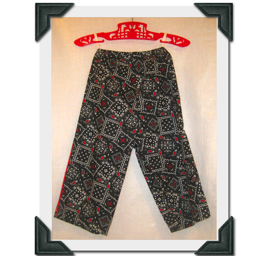 Black/Red Bandana Pants-Size 12M; velcro inside legs, red piping down side seam-100% Cotton-$20.00 + Shipping
